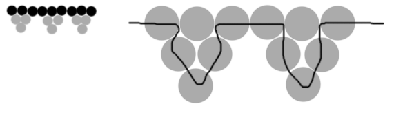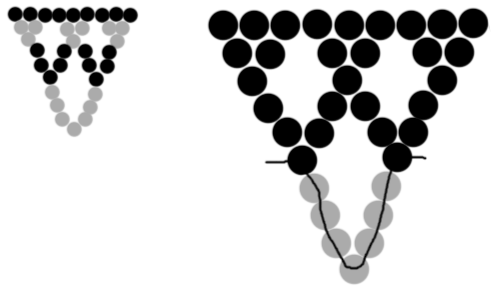 Nun geht man durch die erste Perle durch, zieht drei Perlen auf und geht mit der Nadel durch die übernächsten zwei Perlen durch. Dann wieder drei Perlen aufziehen und durch die übernächten zwei Perlen, usw. |