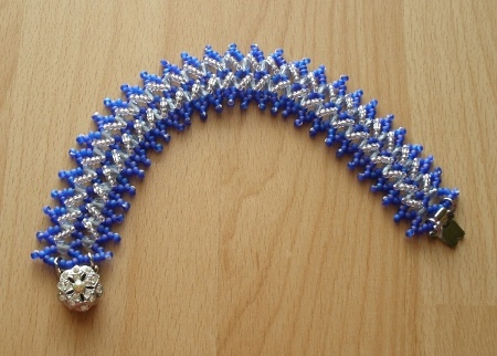 Ich liebe diese Armbänder nach einer Anleitung von Roxanne Thoeny. Diese ist aus matt-blauen Rocailles, silberne Rocailles und hellblauen Facetten.